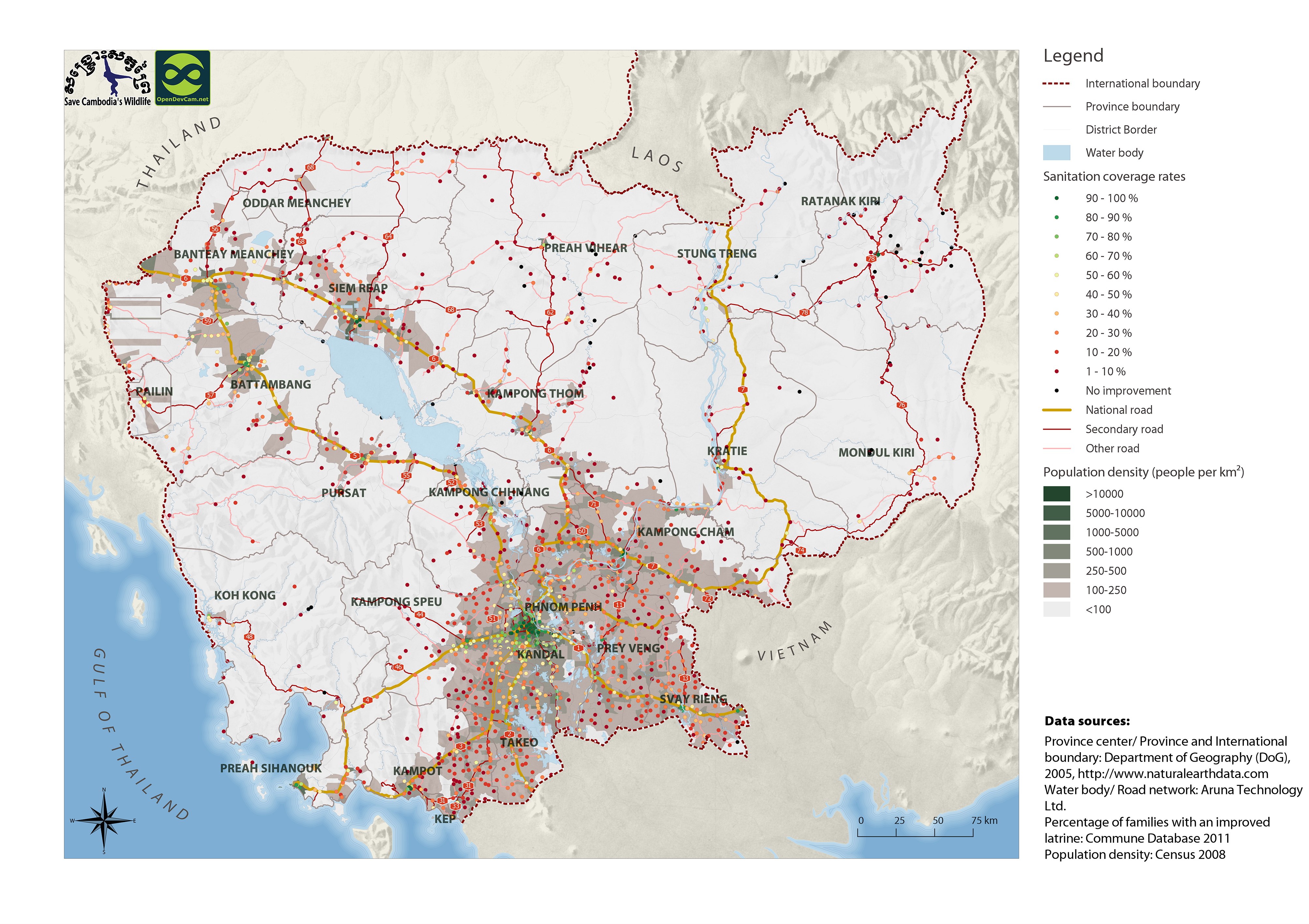 This dataset contains excerpts from the Commune Database produced by the NCDD (National Committee for Subnational Democratic Development). Namely quantitative data about the coverage of improved or unimproved latrines and their ratio per family/household for each commune in Cambodia. Data were provided to ODC in vector format by Save Cambodia's Wildlife's Atlas Working Group.